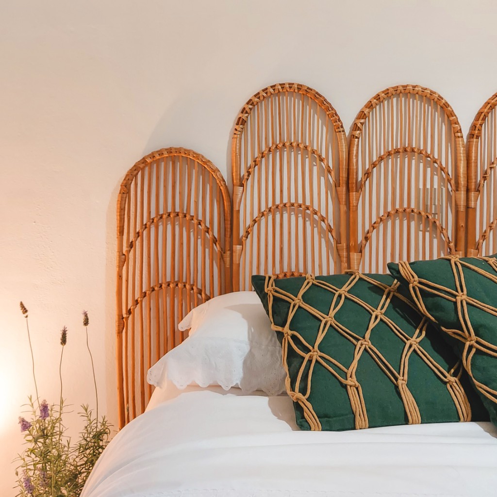 Paredes brancas + roupa de cama clara + cabeceira de vime + luminárias de mesa = santuário para dormir bem e acordar inspirada.